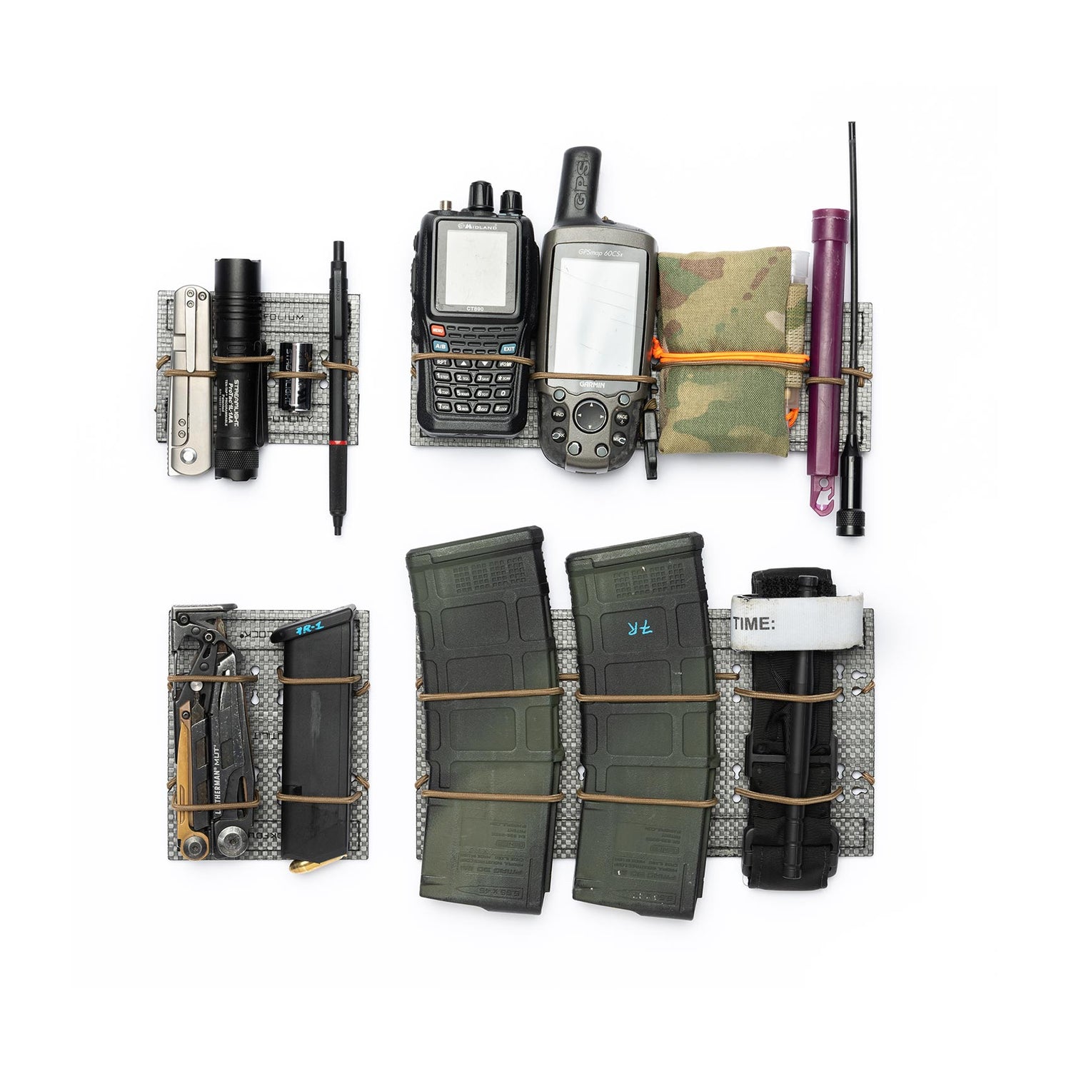 MAG-Utility 4 is the smallest among the panels we developed with two rows of holes: it is suitable to carry long or heavy objects such as pistol mags, multitools, flashbangs, explosives, bandages, tourniquets, or any other item that needs to be secured in two points. If two points are not needed (e.g. shorter objects), please check our EDC-Utility 4 o EDC-Utility 9 panels out.